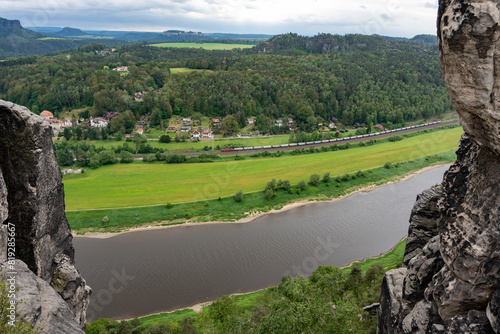 © Jakob, Obraz premium A river with a train passing by. The train is long and has many cars