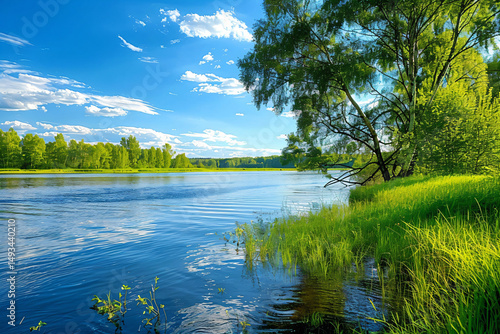 © Le, Fototapeta premium a river with a tree and grass in the foreground