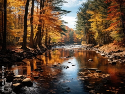 © sam, Obraz premium a river with trees and rocks in the foreground