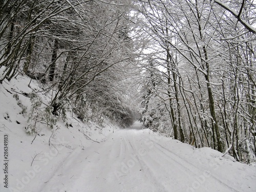 © sebi_2569, Obraz premium a road covered with snow among the trees