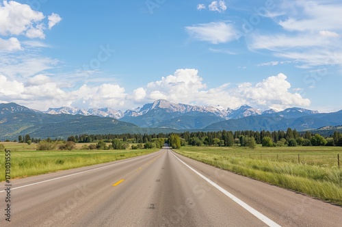 © GenZGraphics, Fototapeta premium A road extends into scenic mountain peaks beneath a clear blue sky dotted with clouds, bordered by lush green meadows.