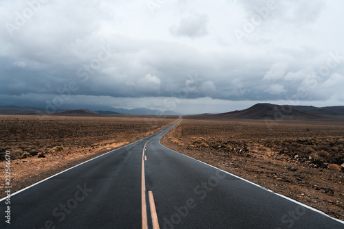 Fototapeta premium A road finds its way through Death Valley as a storm approaches and sunlight...