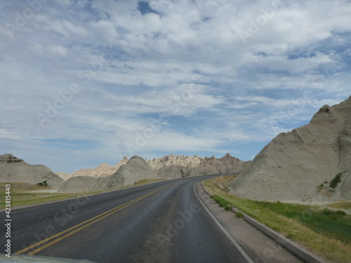 © Jen, Fototapeta premium A road going through the surreal landscape and terrain at Badlands National Park in South Dakota