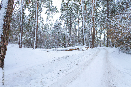 Fototapeta premium A road in a beautiful snow-covered forest