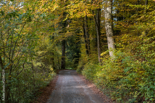 Obraz premium A road in autumn leading through a forest with yellow leaves