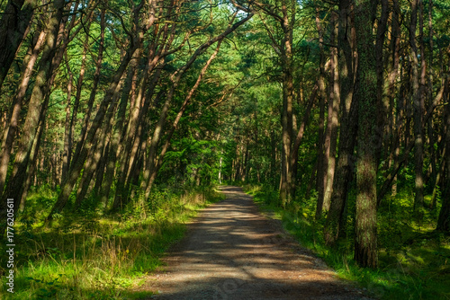 © Николай Батаев, Fototapeta premium A road in the forest. A well-trodden path between the trees. A view of a passage in a summer park.