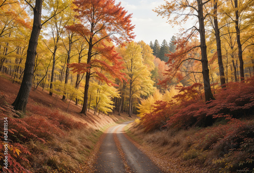 © David Angkawijaya, Obraz premium a road in the middle of a forest with trees in the fall