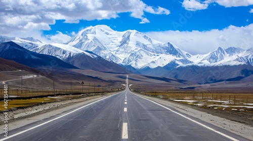 © VISUAL BACKGROUND, Fototapeta premium A road leading to snow capped mountains.