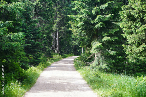© Mariusz, Fototapeta premium A road through a beautiful forest in the Czech Karkonosze Mountains.