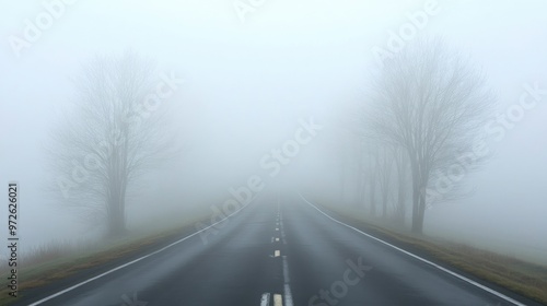 © sujitea, Fototapeta premium A road through a dense fog, with barely visible trees lining the way.