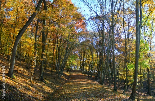 © sebi_2569, Obraz premium a road through forest trees yellowed