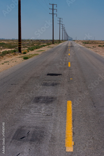 Fototapeta premium A road with a dashed yellow line leads to the horizon in the desert.
