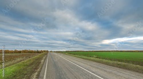 © Sergei, Fototapeta premium A road with a few trees in the background and a cloudy sky