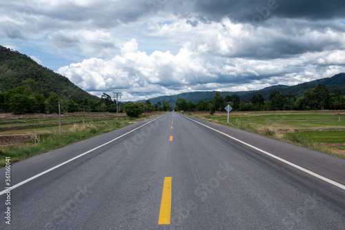 © Thacky, Fototapeta premium A road with a mountain and sky background in Thailand's countryside