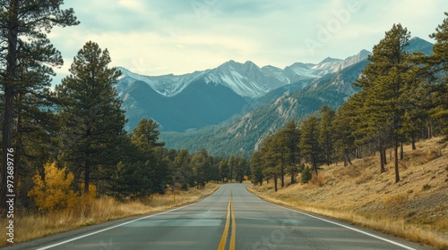© ZeeZaa, Fototapeta premium A road with a mountain range in the background