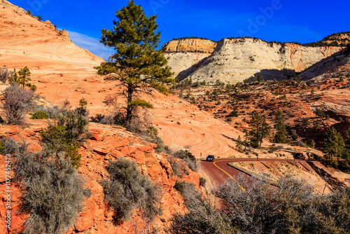 © Scott Prokop, Fototapeta premium A road with a tree on it in the middle of a desert