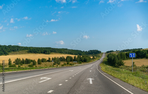 © I, Fototapeta premium A road with dramatic clouds in a blue sky.