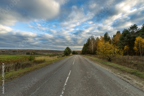 © Sergei, Fototapeta premium A road with trees in the background and a cloudy sky