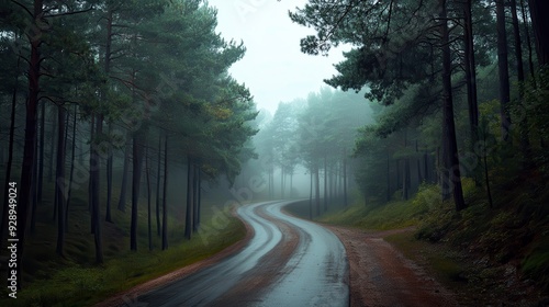Fototapeta premium A road with trees on both sides and a foggy atmosphere