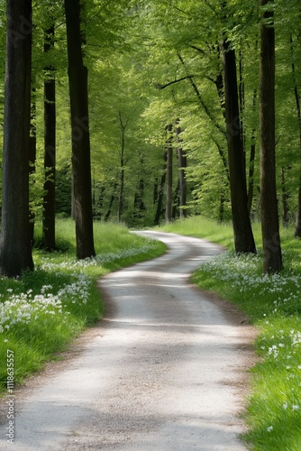 Naklejka premium A road with trees on both sides and a white line down the middle. The road is lined with trees and the grass is green