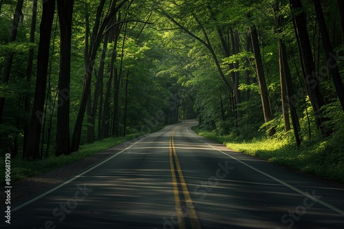 © Imaginary Capture, Obraz premium A road with trees on both sides and a yellow line. Road to somewhere concept