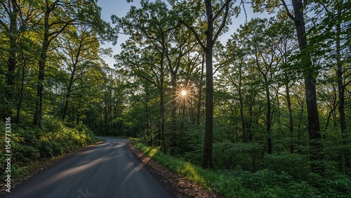 © Karbouski, Fototapeta premium A road with trees on either side and a sun shining on the road