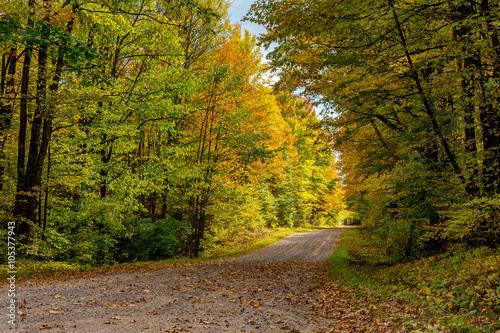 Obraz premium A roadway surrounded by colorful aspen and maple trees in northern Wisconsin...