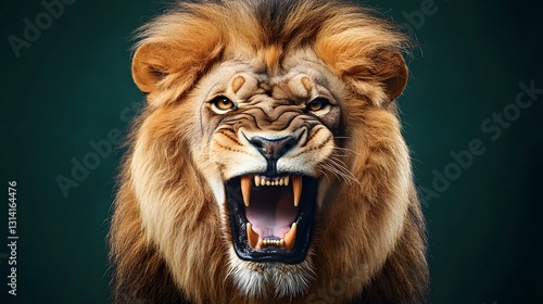 © Phai, Fototapeta premium A roaring lion with a golden mane, its mouth open revealing sharp teeth, with intense eyes, isolated on a dark gradient background