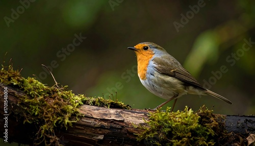 © Misi, Fototapeta premium A robin perches on a mossy log, showcasing its vibrant plumage against a blurred natural backdrop.