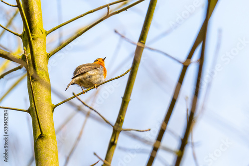 © Matthias, Fototapeta premium A robin sits in a tree with a blue sky in the background