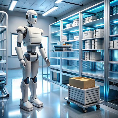 Naklejka premium A robot efficiently organizes medical supplies in a futuristic setting, showcasing advanced technology.