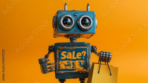 Fototapeta premium A robot enthusiastically holding a shopping bag with "Sale!" written on it,...