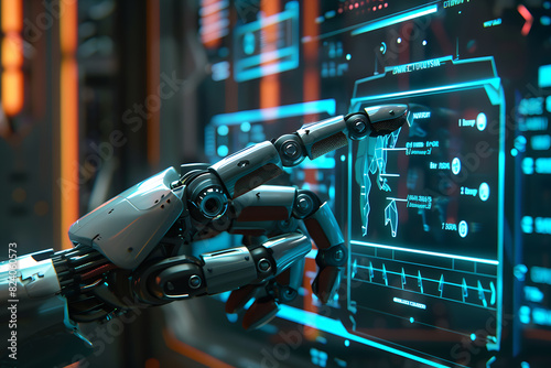 © River Girl, Fototapeta premium A robot hand presses with the index finger on the holographic screen choosing options in a futuristic interface.
