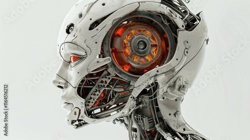 © Formoney, Fototapeta premium A robot head with a yellow eye and orange ear
