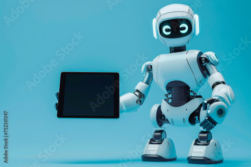 Fototapeta premium A robot is holding a tablet in its hand. The robot is white and has a blue...