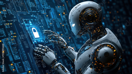 © 沈军 贡, Fototapeta premium A robot is holding in its hand and touching a digital holographic padlock with a blue circuit board background
