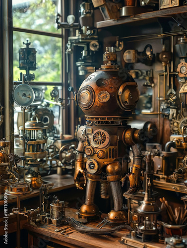 © alfa27, Fototapeta premium A robot is standing in a room with many clocks and other mechanical objects