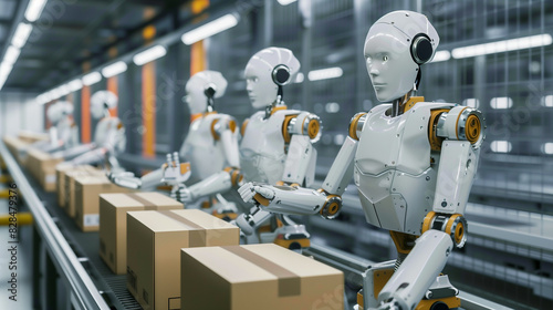 © jiraphat, Naklejka premium A robot is working on a conveyor belt in a factory. The robot is white and has blue eyes. There are several other robots in the scene, all working on the same conveyor belt