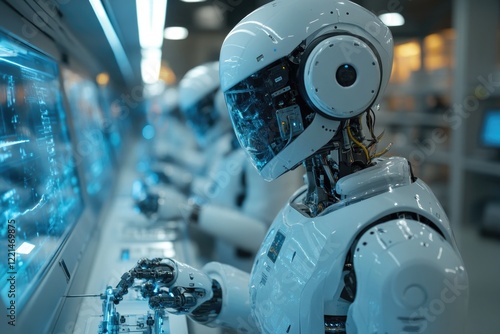 © Ева Поликарпова, Fototapeta premium A robot sitting at a desk with a computer, ready to work or learn