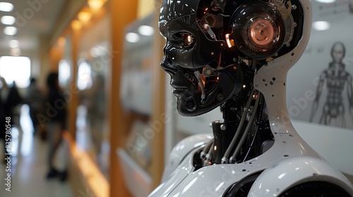 © Emiliia, Fototapeta premium A robot stands before a group of individuals, presenting an intriguing juxtaposition of technology and humanity.