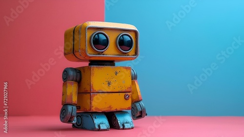 © Wirestock, Fototapeta premium a robot that is on a table in front of a blue and red wall