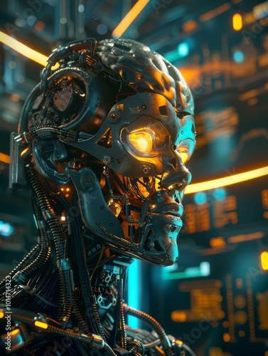 © StasySin, Fototapeta premium A robot with a face made of metal and wires