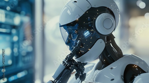 Fototapeta premium A robot with a white helmet and a robotic hand holding its chin in a...
