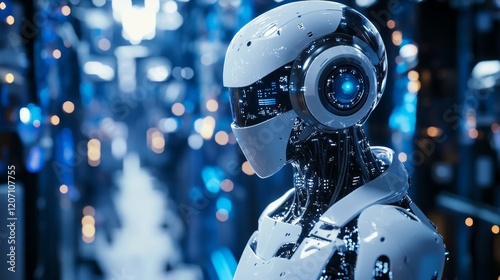 © Cloudyew, Fototapeta premium A robot with a white helmet and blue eyes stands in a room with blue lights