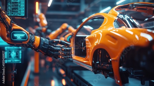 © putri syakilla, Fototapeta premium A robotic arm assembles an orange car in a futuristic manufacturing setting.