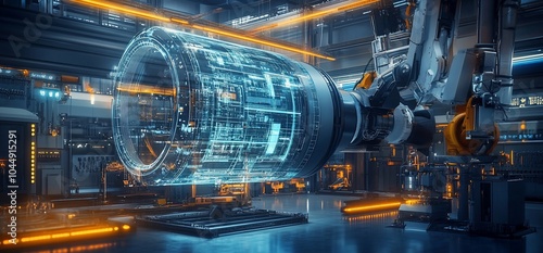 Fototapeta premium A robotic arm holds a futuristic engine with a glowing blue digital interface in a modern factory.