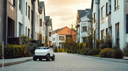 Fototapeta premium A robotic delivery bot, residential neighborhood with robot delivering...