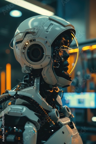 © Vii, Fototapeta premium A robotic head with a computer monitor in the background, suitable for tech-related concepts