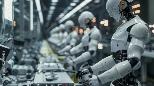 © Yurii Kibalnik, Fototapeta premium A robotics assembly line where humanoid robots are meticulously assembled and tested. Automated systems and human oversight ensure each robot functions perfectly, representing the forefront
