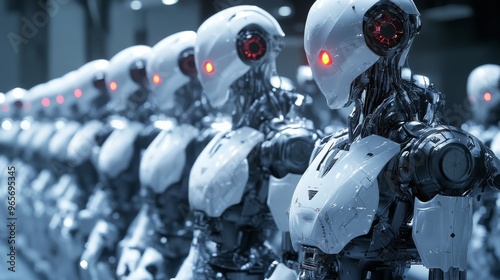 © Oulailux, Fototapeta premium A robotics competition where various AI-powered robots perform scientific tasks, intense atmosphere.